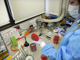 まず、肺炎疑いであれば喀痰、尿路感染症疑いであれば尿、食中毒疑いであれば糞便といったように、感染症を起こしていると思われる部位からの検体を採取して頂きます。微生物検査室では培養により感染している微生物の決定、および試験管内で抗生物質と混ぜ合わせてどの薬がどの程度の濃度で効果があるかを検査してお知らせします。