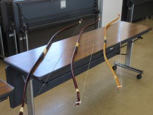 講座では、まず、弓道についての説明を受けた後、実際に使う弓や矢、右手につけるカケといった道具を見て、実際に手に取って触ってみました。試しに弓を引いてみたら、非常に強くてなかなか引けないのを驚かれている方もいました。