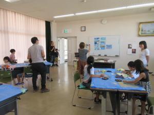 「加西市の空を描こう」と題して、夏休み中に撮影した思い出の空の写真や部屋から見える空の写真を持ってきてもらいその絵を描きました。「雲っていろんな色が入ってる」と黄色やオレンジ、青や黒を入れながらぼかしていき、それぞれ画用紙の上で表現していました。ふわっと浮かんだ雲のもくもく感を出すにはどうしたいいの?との子どもの質問には、「雲の中で一番光っているところは消しゴムを使って白さを強調させます。雲のふちは濃い空の色で囲み、外にぼかすと立体感がでてくるよ。」とのアドバイスがありました。