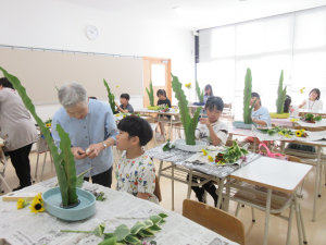 第4回は「松月流(しょうげつりゅう)」、講師の藤原 祥宝(ふじわら しょうほう)先生・井上 典宝(いのうえ みちほう)先生から、松月流が大切にされている ”四季折々に咲く花,緑あふれる木々その素材·生性を大切にして、そこに生ける者の感性と芸術を加えること” について、今回は最初に生け終えた見本を示しつつ、お二人が子ども達の生けるペースに合わせて、きめ細かく·分かりやすく·熱心に、机間指導を中心にご指導いただきました。今回ご準備いただいた花は、ひまわり(黄)·ヒペリカム(赤)·スターチス(ピンク)·オンシジューム(黄)と、色とりどりの小さく可愛らしい花ばかりでした。子ども達は思い思いに創造力を発揮しつつ、本当に優しい気持ちで楽しそうに取り組んでいました。今回で4回目のお稽古となり、お教えいただける市内7流派も折り返しとなりました。生け方も手際よく、時には大胆に個性あふれる作品を仕上げることができています。また、片付けも本当に上手に丁寧にできていました。